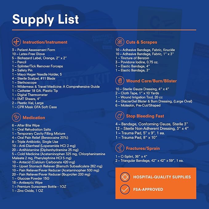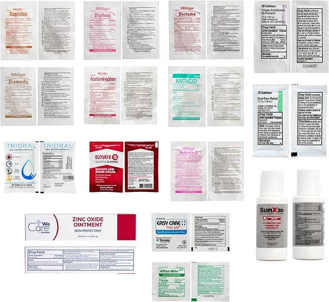 • Advanced Trauma Supplies: Includes a CPR mask with O2 valve, C-Splint, trauma pads, and a variety of medications for your camping essentials, first aid supplies, or survival kit