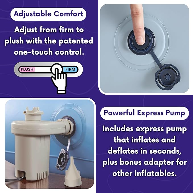 • Features a vertical beam construction with built in edge support that prevents rocking, swaying, and side-to-side motion; Includes Electric Express Pump that inflates and deflates hands free within seconds
