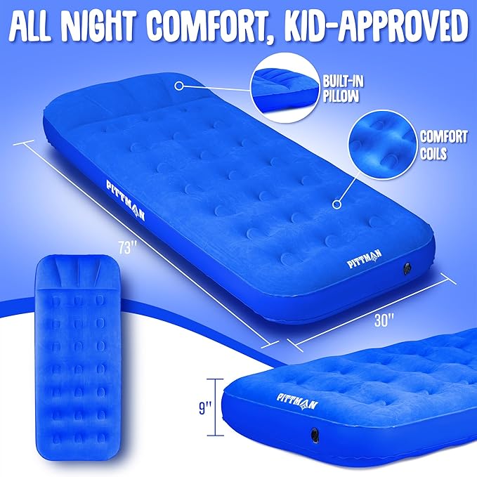 • Comfort & Convenience - Your Twin blow up mattress for kids comes with a built-in pillow, giving your child a dreamy night's sleep with a surface measuring 73" x 30" x 9"