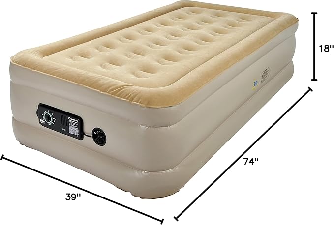 • PREMIUM CONSTRUCTION: Constructed with heavy-duty waterproof puncture-resistant materials. This Air bed sits tall like a traditional bed, futon, or sofa bed. At 18" tall any guest should be able to get in and out of this guest bed with ease. This portable twin air mattress with built-in pump is a premium sleep solution for anyone looking for the best night's sleep.