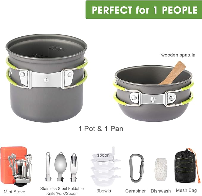 • 【Affordable and Great Value for Money】 Package 13 pieces includes mini rocket stove x 1, non-stick pot x 1 and camping pan x 1, stainless steel foldable knife x 1+ fork x 1+ spoon x 1+ bowl x 3 sets, wooden spatula x 1, loofah sponge 1, carabiner x 1.