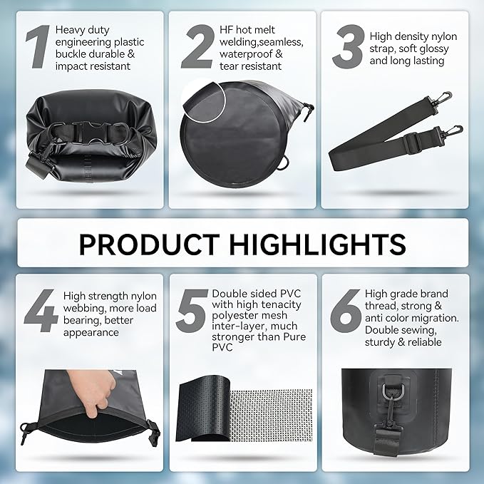 • Floatable and Trackable: The dry sack can float on water without sinking after being rolled up and buckled, so you can quickly track and retrieve your stuff. The D-ring and strap on the bag make it easy to attach to the boat, keeping your stuff always with you without getting lost, allowing you to enjoy thrilling outdoor activities with peace of mind.