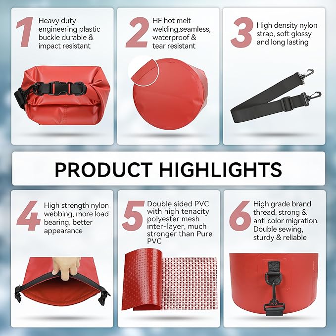 • Floatable and Trackable: The dry sack can float on water without sinking after being rolled up and buckled, so you can quickly track and retrieve your stuff. The D-ring and strap on the bag make it easy to attach to the boat, keeping your stuff always with you without getting lost, allowing you to enjoy thrilling outdoor activities with peace of mind.