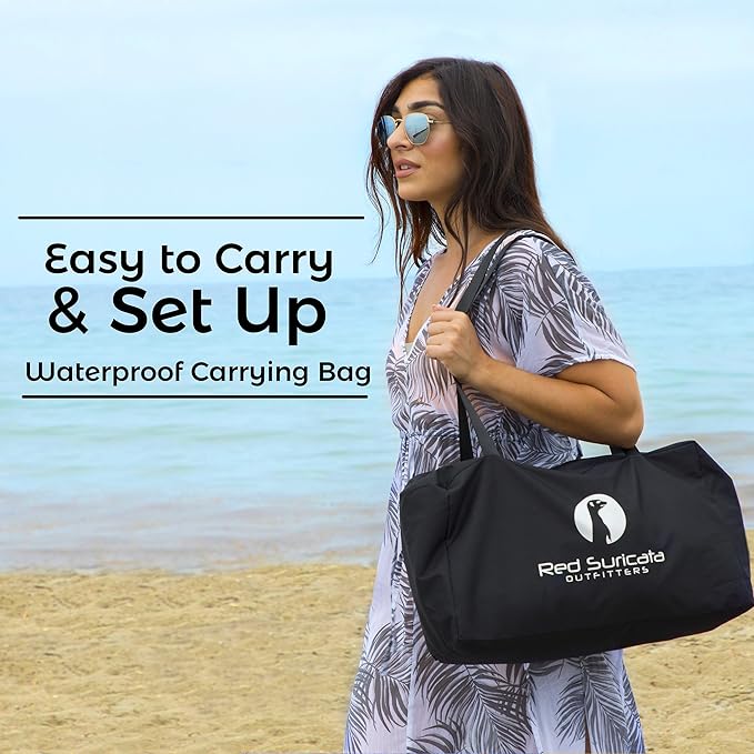 • SIT IN TOTAL COMFORT IN THE BIGGEST SHADE AREA ➤ Red Suricata offers the first FULL HEIGHT CANOPY that includes FOUR TALL POLES increasing the shaded area by 50%! The medium beach tent fits 3-4 adults lying down, and our large beach canopy tent fits 6-7 adults lying down. Rain? We got you covered with our canopy now featuring water repellent fabric making it an excellent rain shelter.