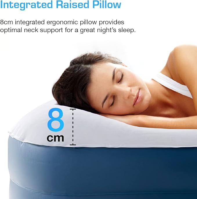 • BUILT-IN PILLOW: This blow up mattress with a built in pump also features a unique 3-inch built-in raised pillow for improved head and neck support, and improved spinal alignment for bed-like comfort throughout the night.