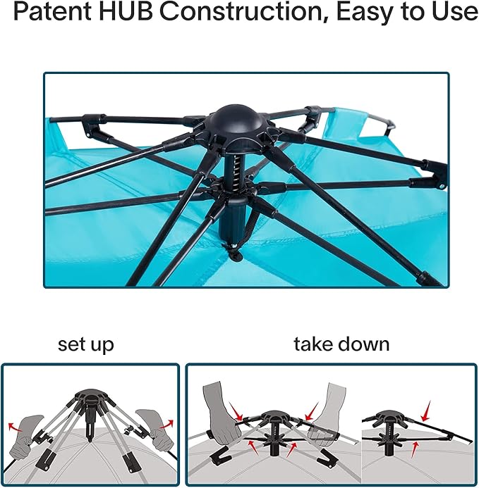 • ☀PATENTED AUTOMATIC OPEN sun shade beach tent on the Market : Patent pending HUB mechanic system on the top,which make tent open by itself effortless. Sturdy and rigid fibre glass frame supports the tent without worry of collapse.