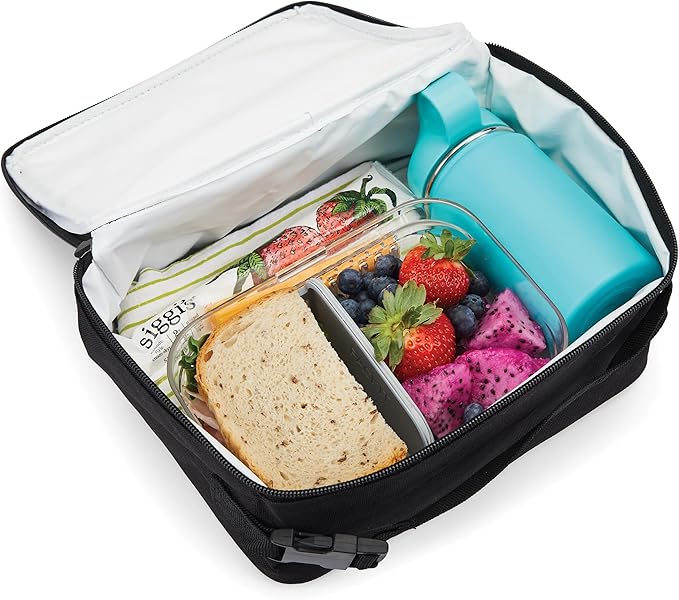• Large zip opening allows for faster top-load packing and locks in cool, dry air. A buckle handle conveniently lets you attach this lunch box to backpacks, messenger bags, sports bags and more. The exterior mesh side pocket holds an 8oz water bottle, utensils and napkin or snacks. A zip pocket stores ID cards or wipes