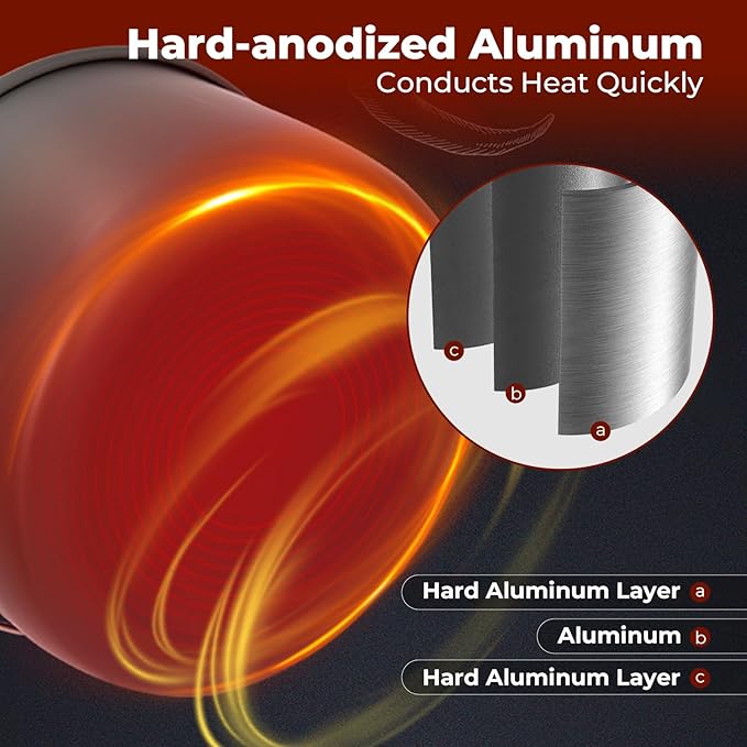• Food-grade Material: The camping mess kit is made of safe, non-toxic aluminum with non-stick coating for easy cleaning. Hard-anodized aluminum conducts heat quickly, stand high temperature, corrosion-resistant, rust-free, built to last. Heat-resistant handles to keep your fingers safe from the heat. Secure and anti-scald.