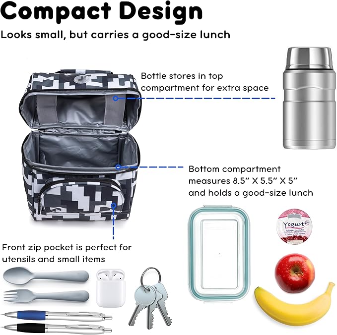 • Versatile – Works well as a boys lunch box for school, a kids insulated lunch box, or as a compact middle school lunch box. For age 8 years and up