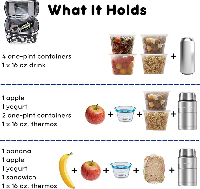 • What It Holds — Insulated lunch box holds a 12-16 oz drink, a yogurt cup, a fruit cup, a small cottage cheese container, an apple, and 2 frozen gel packs