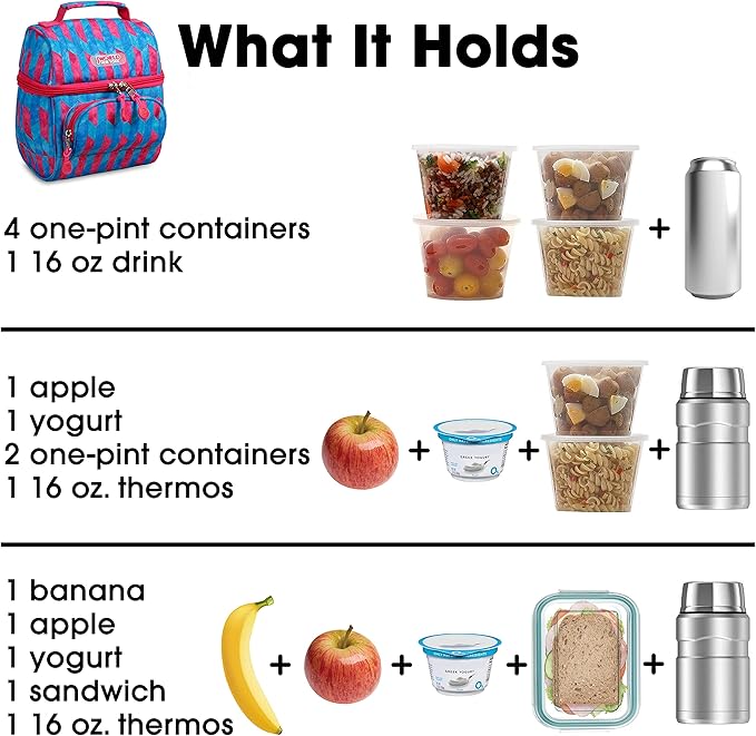 • What It Holds — Insulated lunch box holds a 12-16 oz drink, a yogurt cup, a fruit cup, a small cottage cheese container, an apple, and 2 frozen gel packs