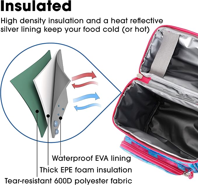 • Insulated — High density insulation and a heat reflective silver lining keep your food cold (or hot) in this thermal lunch bag