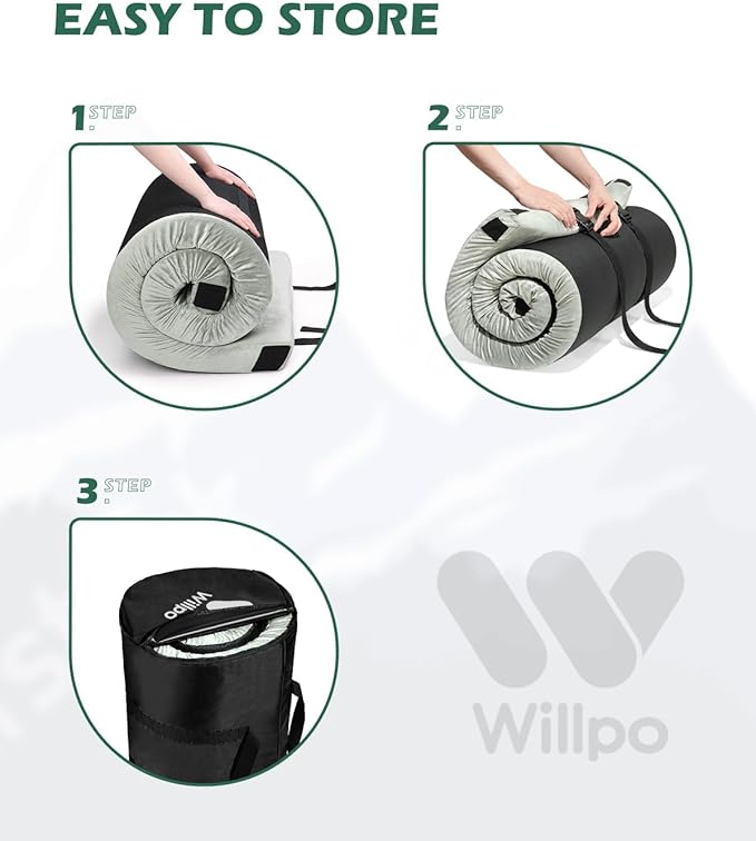 • 【CertiPUR-US Memory Foam Inner Core】High-density base foam prevents sagging, pressure-relieving memory foam adapts to body shape, airflow layer reduces heat. NO MORE back pain or annoying discomfort from rocky terrain from Willpo sleeping pad.
