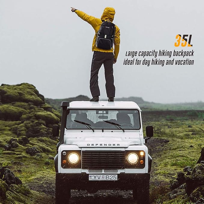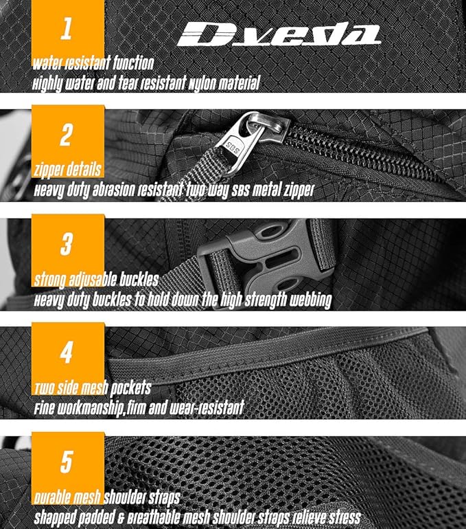• 🚵★ Enjoying Your Hiking Backpack★ :Dveda 35L hiking backpack ideal for Disney day trip, day travel, overnight trip, camping, day hiking and vocation. Great hiking backpack for women and men. Its rip-resistant nylon construction sheds rain and resists wear better than cheaper polyester. Our Products have 12 moths Replacement Service and 100% Satisfaction, If you are not Satisfied with your Purchase for Any Reason, Please Feel Free To Contact Us.
