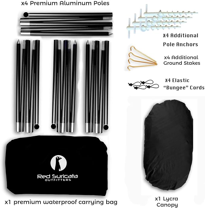 • LIGHTWEIGHT HI TECH ALUMINUM POLES ➤ Red Suricata is the ONLY company that has TALL aluminum poles with a pointed stake at the bottom, so you can stick them straight into the sand or ground. Our “patent pending” poles are colored, foldable, lightweight, and rustproof! Plus, the top of the pole has a robust plastic ball that WON’T rip the fabric.