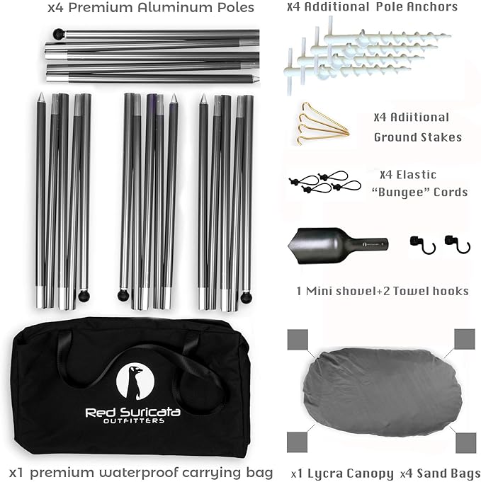 • LIGHTWEIGHT HI TECH ALUMINUM POLES ➤ Red Suricata is the ONLY company that has TALL aluminum poles with a pointed stake at the bottom, so you can stick them straight into the sand or ground. Our “patent pending” poles are colored, foldable, lightweight, and rustproof! Plus, the top of the pole has a robust plastic ball that WON’T rip the fabric.