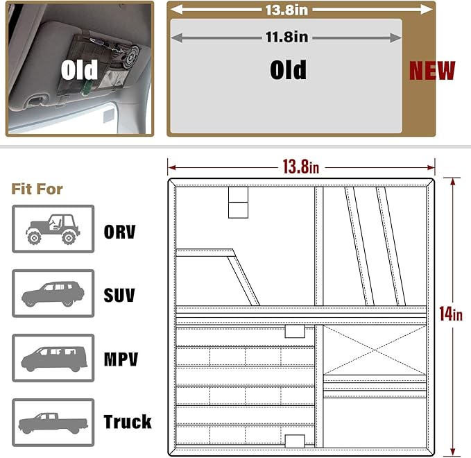 • ENLARGE SIZE AND OPTIMIZED FOR TRUCK PICKUP: Car visor organizer is larger and wider especially design for the common truck and pickup in the American market like fitting for Ford F150 F550, Dodge Ram, Toyoda Tacoma, etc. Unfolding Dimension: 13.8" * 14", Folding Dimension: 13.8" x 7"