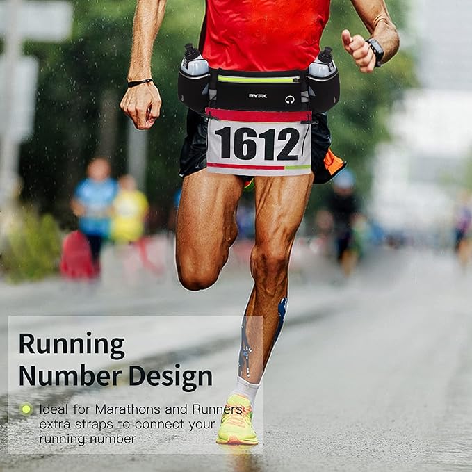 • ➤ PROFESSIONAL DESIGN:1. Adjustable strap that comfortably fits waist from 25 inches to 60 inches. 2. There is a hole to insert the headphone, enjoy the music during running. 3. Two extra pockets to carry the water bottle and the strap above the pocket can secure the water bottle. 4. You are noticeable at night because of the reflector straps printed on the belt. 5. This runners water bottles has straps to attach a race number so it makes a great race number belt or tri race belt.