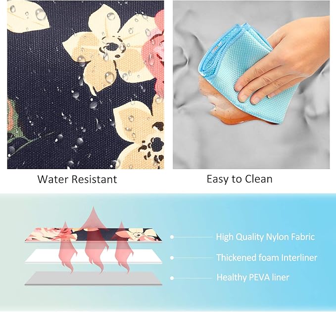 • Durable Structure -- (1)Exterior made of heavy duty Nylon fabric, water resistant & scratch resistant, and keep its shape well. (2)Interior is thick foam padding and soft PEVA insulated, preserve food cold or warm for 6 hours. (3)Top handle and side shoulder strap with reinforced stitching ensuring maximum durability. (4)PU leather Bottom with 4pcs feet makes this lunch bag stand alone by itself.