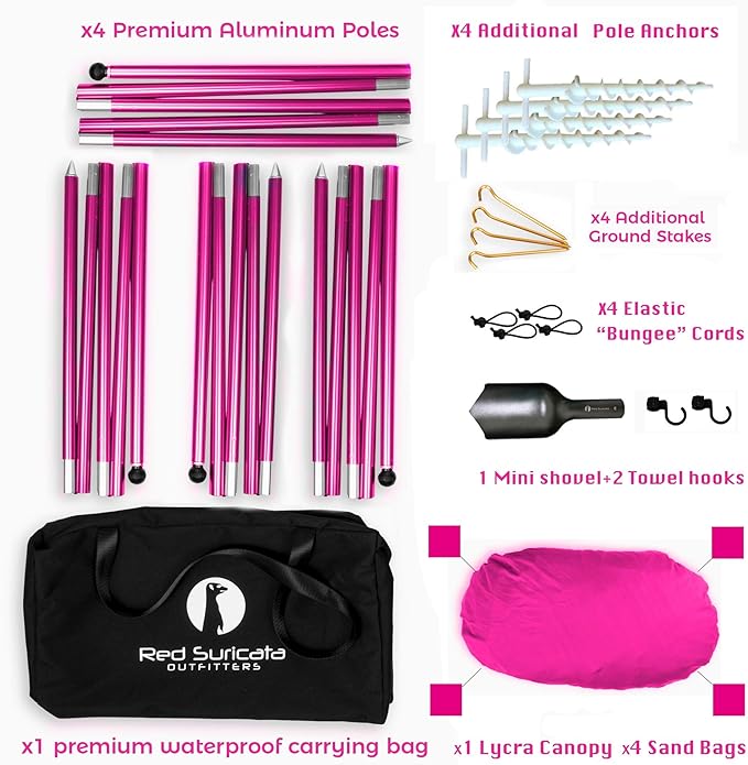 • LIGHTWEIGHT HI TECH ALUMINUM POLES ➤ Red Suricata is the ONLY company that has TALL aluminum poles with a pointed stake at the bottom, so you can stick them straight into the sand or ground. Our “patent pending” poles are colored, foldable, lightweight, and rustproof! Plus, the top of the pole has a robust plastic ball that WON’T rip the fabric.