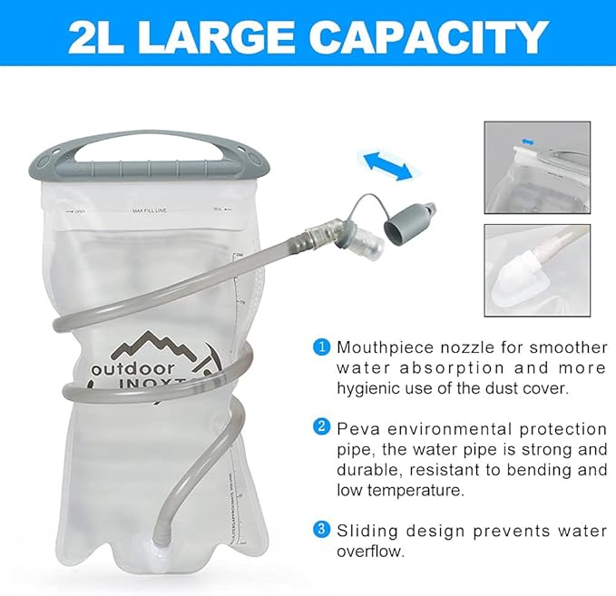 • 【2L Hydration Bladder 】◕‿ ◕:The 2 liter hydration water bladder can fill water and ice super quickly, it is more convenient to clean no matter when the water temperature is range -20~+50℃.the water tube (40"length,0.4"diameter) provides a healthy flow for easy drinking.