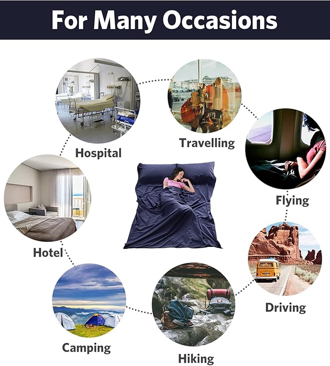 • 【Function of Sleeping Bag Liner and Complete with Pillowcase】: sleeping bag liner is breathable and comfortable, which is ideal to bring to hotels, youth hostel, or anywhere else you might travel. Take comforter off bed and use this sleeping bag liner to sleep in and it will give you a sense of cleanliness. You can use this versatile travel sleeping bag liner inside your sleeping bag to keep it clean, or use as a stand-alone sleep cover or sleeping bag in very warm climates