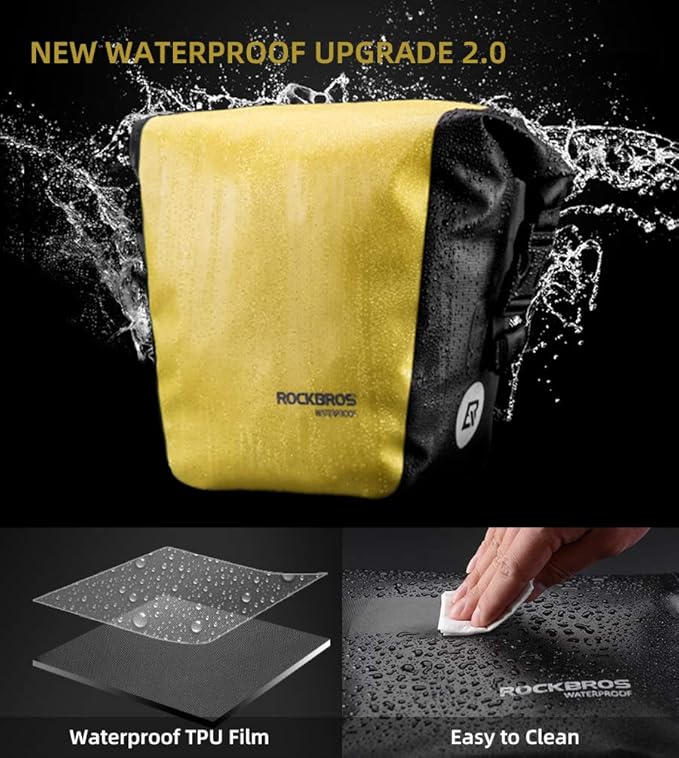 • SEALED WATERPROOF: Made of 840D Nylon material with TPU film shrouded, this bike pannier is waterproof, sturdy and tear resistance.With crimping closure method, opening is not directly in contact with water, and waterproof effect is better than ordinary zipper closure method. Surface mud and water can be easily removed.