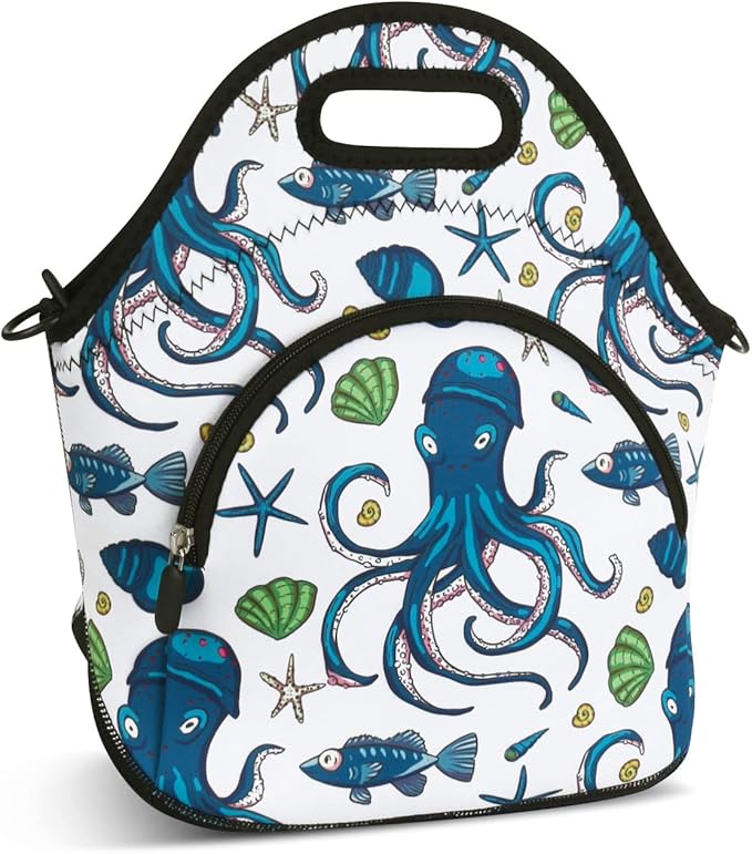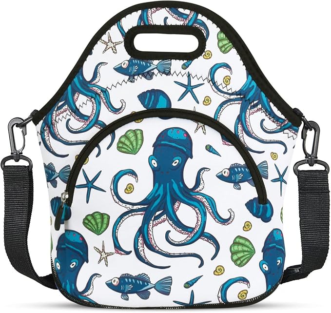 Violet Mist Womens Insutated Neoprene Lunch Bag Resuable Thermal Cute Cartoon Lunch bag with Pocket Detachable Adjustable Shoulder Lunchbox Handbags Container Women Men Adult Gifts(Bule Seaa Animal)