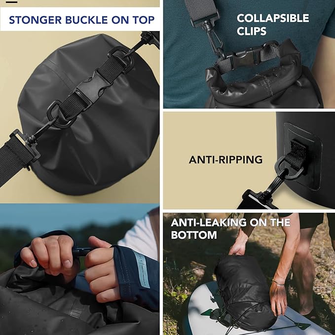 • ANTI LEAK AND ANTI TEAR: Features fully welded seams by high-frequency tech, our dry sack provides a stronger and more durably waterproof construction. Abrasion resistant for long lasting, perfect for boating, fishing, paddling, swimming and hiking