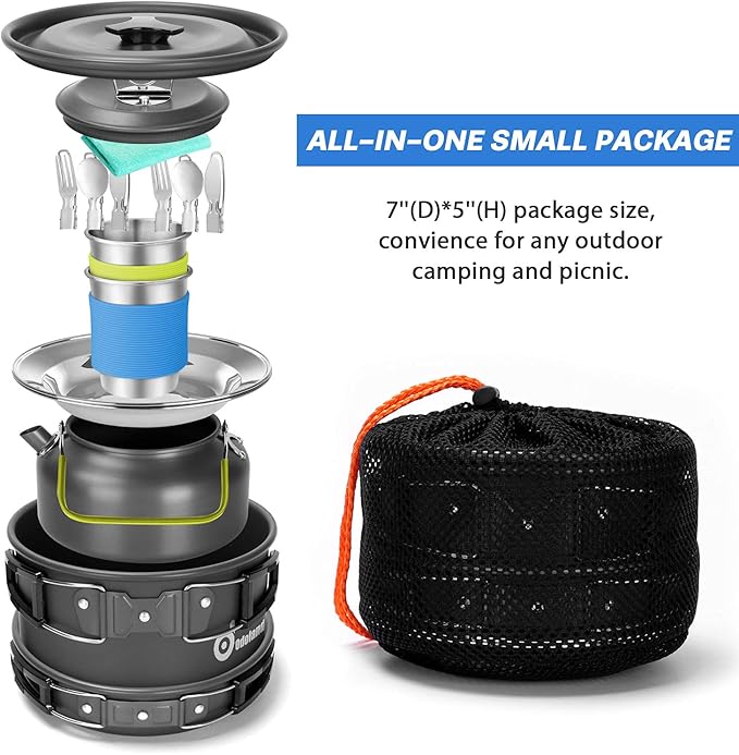 Odoland 15pcs Camping Cookware Mess Kit, Non-Stick Lightweight Pot Pan Kettle Set with Stainless Steel Cups Plates Forks Knives Spoons for Camping, Backpacking, Outdoor Cooking and Picnic