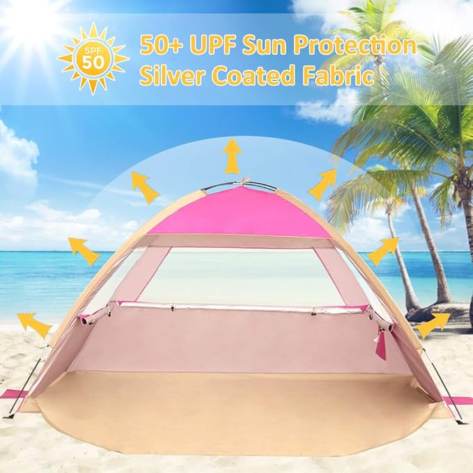 • Updated Material: Venustas beach canopy has premium 190T Special silver coated polyester fabric, 4 layers of fabric to achieve UV protection, shading, and heat insulation. 4-sided ventilation design providing excellent ventilation. The floor extends 40 inches for an extra activity room. 3 curtains protect your privacy.