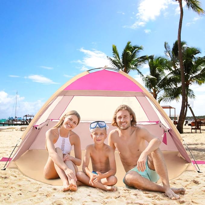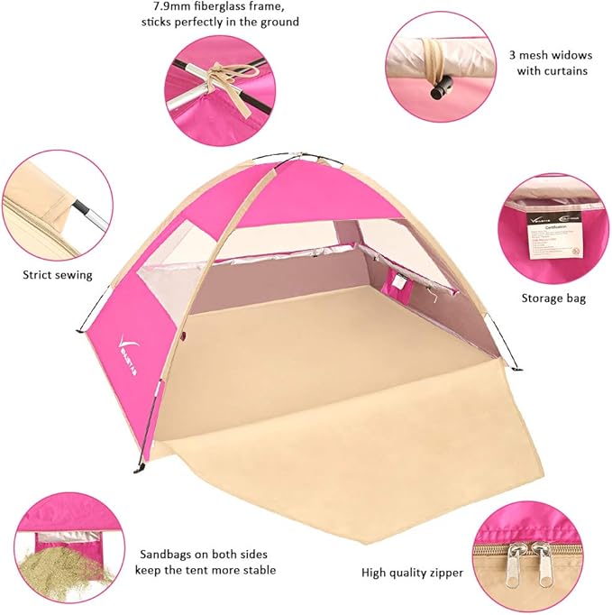 • Easy Set Up: Venustas shade sun tent is much easier to fold than a Pop-up tent. Setting up this beach tent is a fast and easy process that can be done in minutes. The unique folding capability of this tent allows it to be taken down and stored anywhere. It could also fold into a portable carry bag.