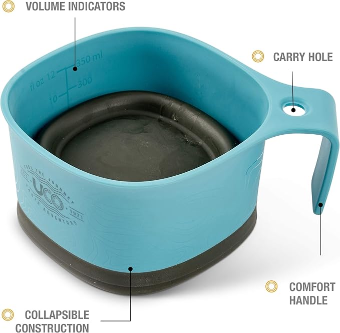 • Camping Cup: 12-ounce collapsible camping mug features a flexible TPE base that stows inside the rigid rim for added convenience and improved packability.