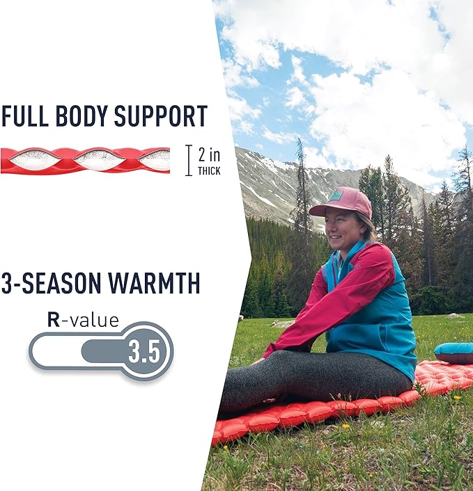 • Ultralight insulated women’s air mattress provides a warm and comfortable sleeping surface for 3-season (3.5 R-Value) backpacking, adventure racing, and bike touring