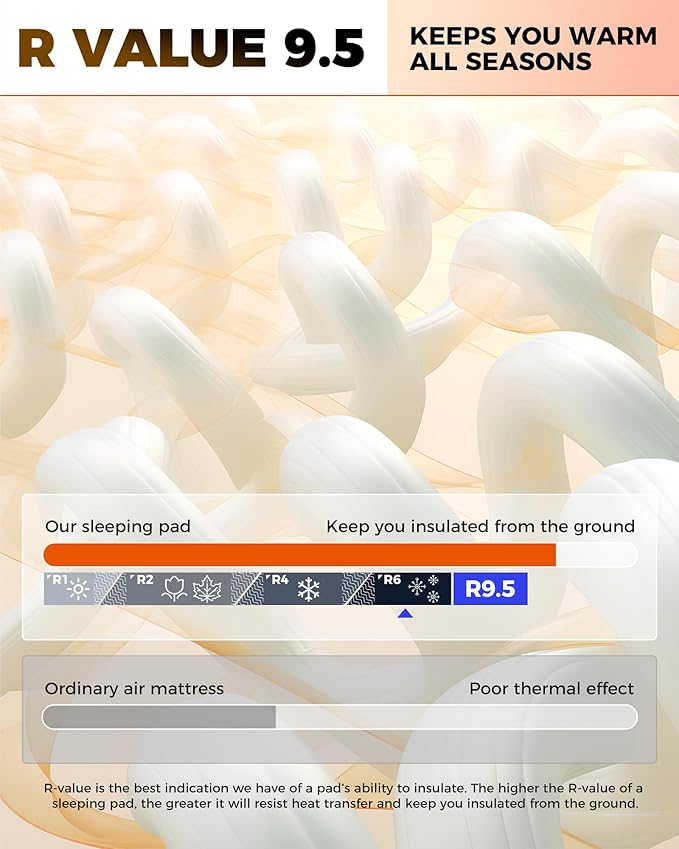 • HIGH R-VALUE 9.5 FOR SUPERIOR INSULATION: The KingCamp foam sleeping pad boasts an impressive R-value of 9.5, offering excellent insulation to keep you warm by effectively blocking the cold ground. Whether you're camping in chilly spring, fall, or winter conditions, this pad ensures you stay cozy and comfortable all night long.