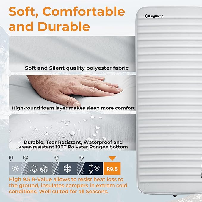 • HIGH R-VALUE 7.9 FOR SUPERIOR INSULATION: The KingCamp foam sleeping pad boasts an impressive R-value of 7.9, offering excellent insulation to keep you warm by effectively blocking the cold ground. Whether you're camping in chilly spring, fall, or winter conditions, this pad ensures you stay cozy and comfortable all night long.