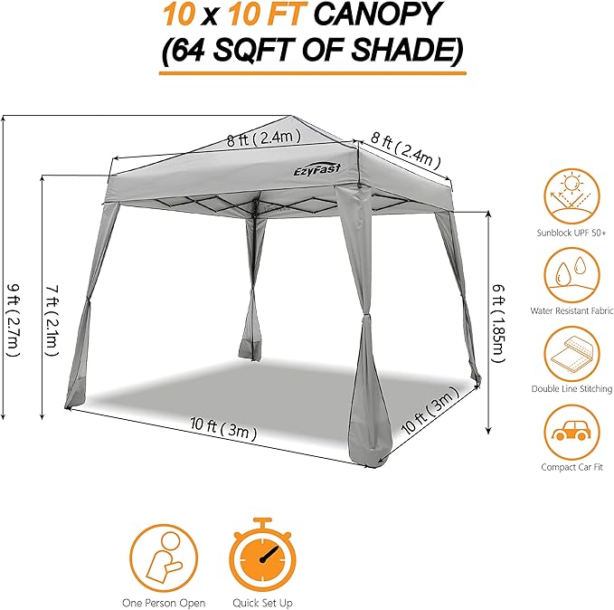 • CANOPY SIZE: 10x10 ft at the base with 8x8 ft canopy fabric top. Provides 64 sq ft of shade coverage.