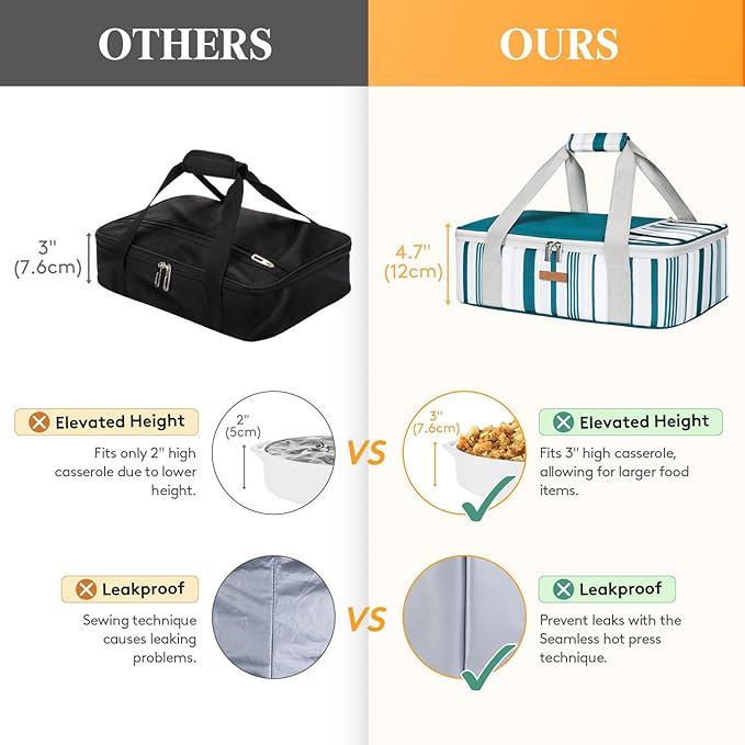 • Keep Food Hot or Cold Hours: The interior lining is made of food-grade aluminum foil and padded with 8mm EPE foam for great thermal resistance. The exterior of the Casserole Carrier is made of 600D water-resistant, dirt-proof Oxford fabric for long lasting durability and easy cleaning.