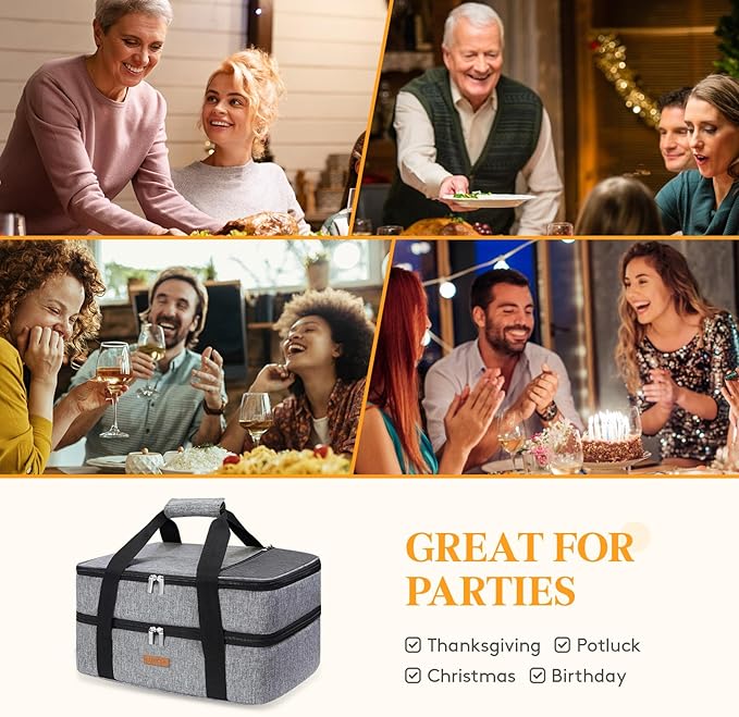 Double Decker Insulated Casserole Carrier for Hot or Cold Food, Lasagna Holder Tote for Potluck Parties/Picnic/Cookouts, Fits 9"x13" Baking Dish, Grey