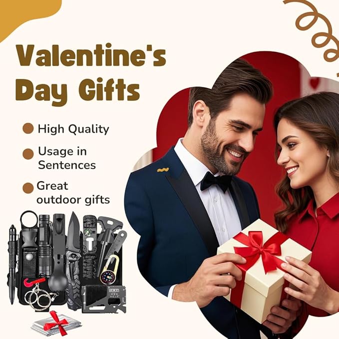 • 👍 Versatile 14 - in - 1 Survival Kit for Valentine's Day: Combines survivor essential tools. Suits Gifts for men of all ages (young adventurers to dads). Ensures preparedness for romantic camping, challenging hikes, or emergencies with survival gear and supplies military grade for durability & reliability, a must have outdoor lovers tools for men who have everything seeking a unique Valentine's gift.