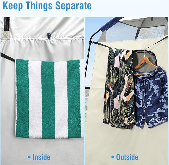 • 【Best Privacy Room】 A large zippered entry door provides easy access and 2 double-layered (cloth + mesh) windows , which can be closed or opened. Also, the mesh tent top with removable waterproof top rain fly. Both privacy and ventilation are very good. There are also 2 storage bags inside for storing toiletries. 1 inside strap for hanging your changing clothes and 1 outside strap to keep clothes and towel dry