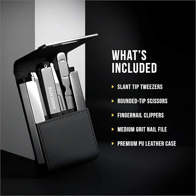 • WHAT'S INCLUDED: Slant-tipped tweezers, rounded point scissors, fingernail clippers, medium grit nail file, in a compact premium PU Leather case.