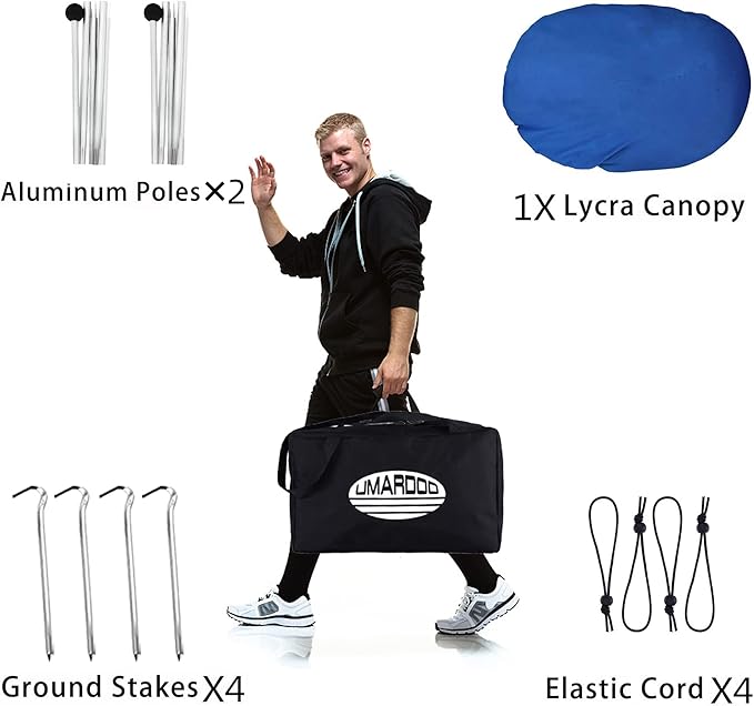• Sun Protection UPF50+: The strong and elastic Lycra fabric has UPF 50+ protection and water-resistant function. Rust-proof aluminum poles are attached with a elastic cord preventing moving. Enjoy longer hours under the sun without worrying about sunburns.