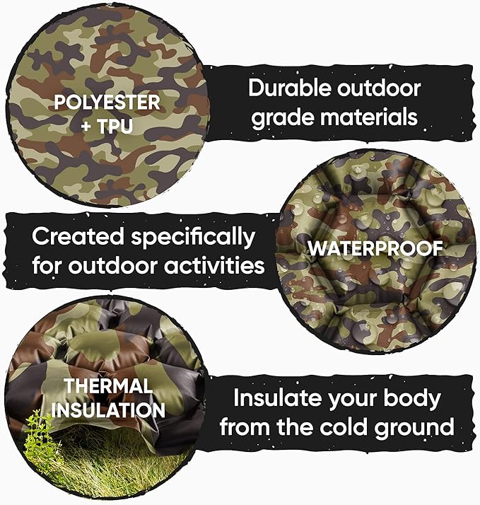 • UNIQUE LONGLASTING DURABILITY: It's the mat of all mats! The inflatable sleeping pad is made of durable, outdoor grade materials. It includes thermal insulation, to keep your body warm from the cold winter ground. Our camping sleeping mat is 100% waterproof, making it perfect for any outdoor activities. You can say goodbye to sore backs and other discomforts normally left by bumps and rocks underneath the floor of your tent!