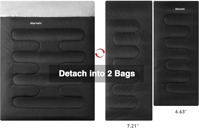 • FREE COMBINATION& DETACH - Roomy, rectangular shape provides maximum comfort and easily fits 2 people, so lofty and wide even for two big and tall persons to have plenty of room to stretch out. Double sleeping bags can be unzipped and separately zip into two individual sleeping bag. Sleeping bag of all size can unzip into a blanket for car camping