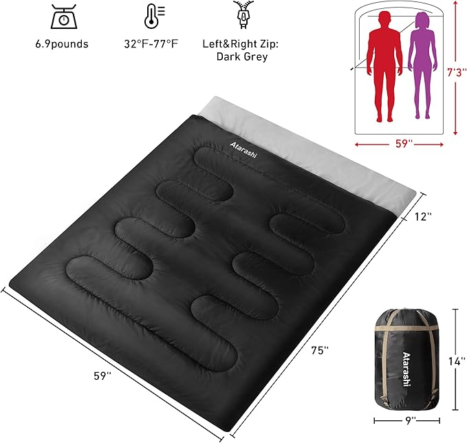 • SIZE & FILL - XXLarge 2 Person sleeping bag measures 59" by 87", fits most adults or kids up to 5'11" tall; The sleep bag with 12oz/yd² polyester insulation. The filling material is 400GSM, temperature rating 32-77°F(0-25°C), warm and comfortable, fits for 3-4 seasons camping & outdoors; Weight:6.9 lb