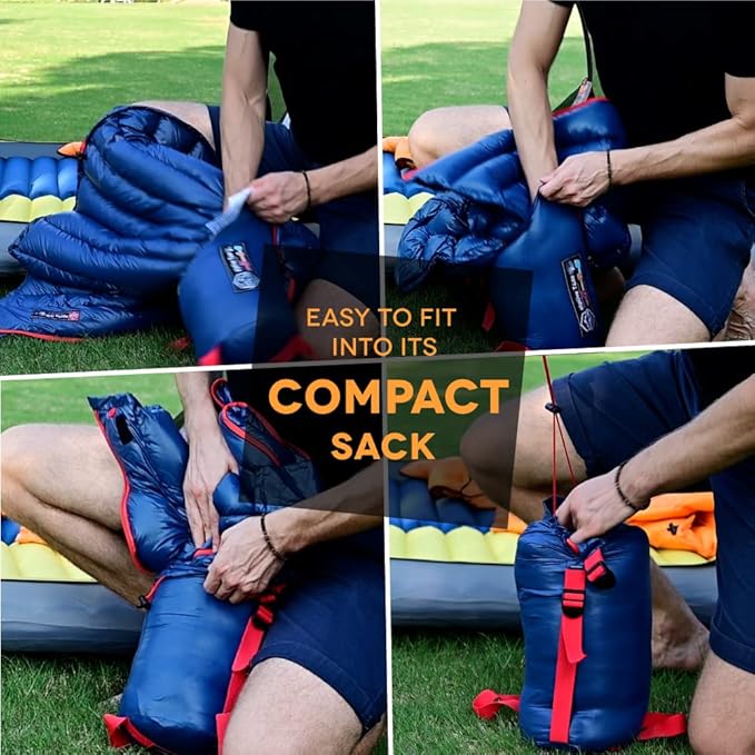 • ✅ LONG LASTING DURABILITY - Premium 650-fill down offers excellent warmth-to-weight ratio, protects insulation from heat-robbing moisture, Tough 20D nylon shell fabric is treated with a durable water-repellent finish to shrug off moisture. Two of 2-way YKK zippers has an antisnag slider to reduce snagging, makes getting in and out of the sleeping bag a breeze through.