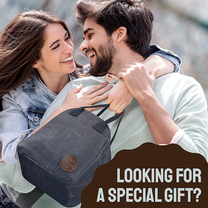 • QUALITY MATERIAL: The sturdy waxed canvas of this adult lunch box is indicative of high-quality. For best results, leave the lunch box closed 24h with a food container inside to regain its shape. This reusable insulated lunch bag keeps your meal warm or cool all day! It's spacious but compact, allowing you to carry ample food without being bulky