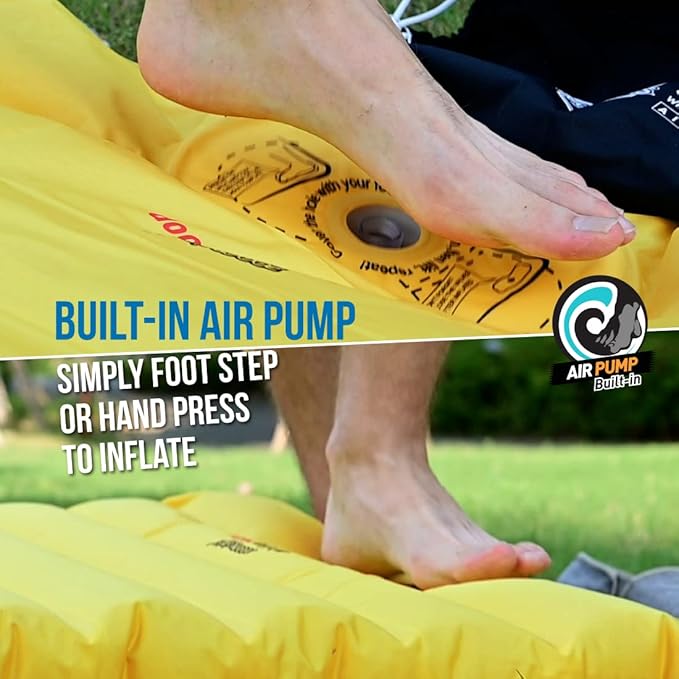 • ✅ BUILT-IN AIR PUMP TECHNOLOGY - Simply foot stomp or hand press to inflate, allowing you to air your camp pad up within 2-3 mins only. This Integrated pump is the fastest, easiest way to inflate your camping mat, and also avoids introduce moisture into the interior by mouth blowing. And the outtake valve has the double-decked design with a multi-functional, micro-adjustable valve in, which is used for fast deflating and can also be used for electric pump inflation.