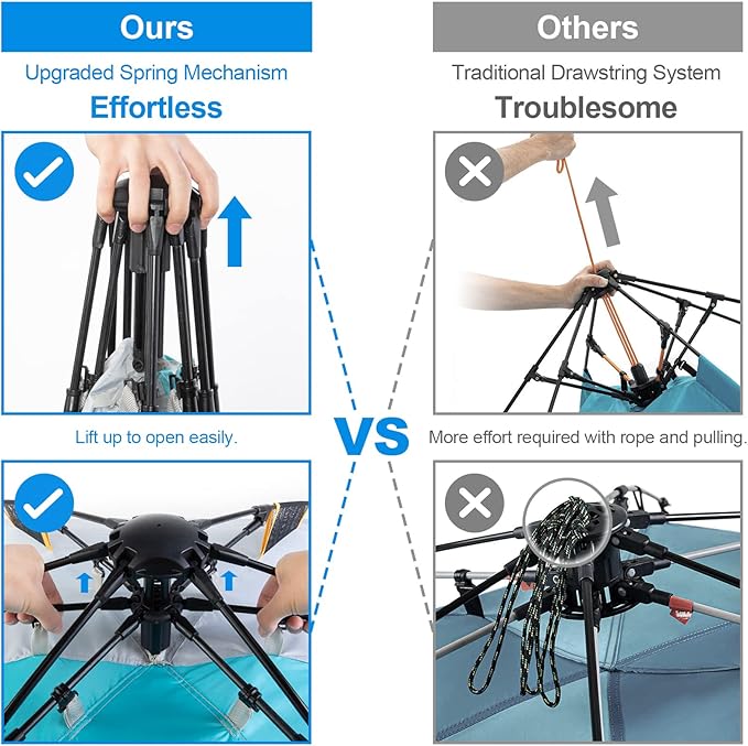 • Easy Setup & Super Stable: The specially designed spring opening system shows an industry-leading level of improvement. One person can set up the beach canopy easily in seconds. Compared to the drawstring design, this one is faster, effortless, and saves more time.